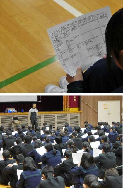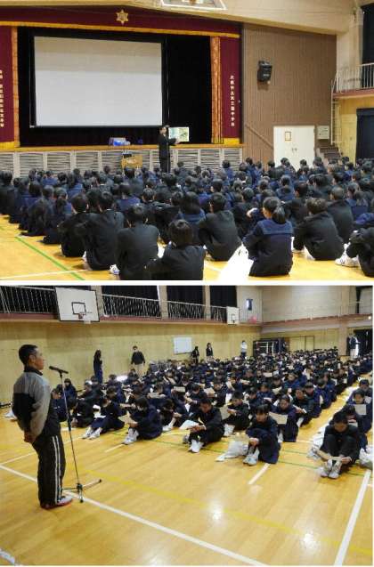 始業式の中で、担当の先生から、生活指導についてのお話がありました。東三国中の指導基準のプリントを配布しました。ルールを守って東三国中の全員が安心で安全な学校生活が送れるように皆で作っていきましょう。
