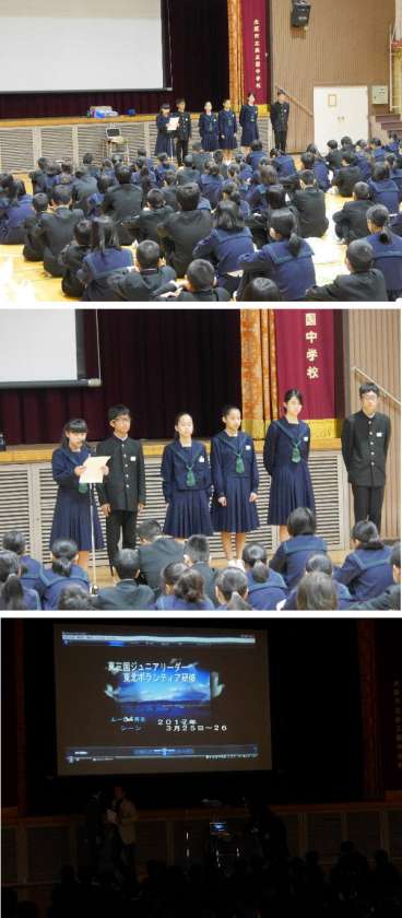 3月25日〜26日に、東三国中のジュニアリーダ6名が東北を訪問研修をおこなってきました。東北大震災から6年がたった今も復興にむけた取り組みがつづきます。被災された方々の思いを受け止める研修となりました。その研修内容をジュニアリーダから報告があり、写真で紹介されました。