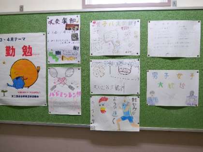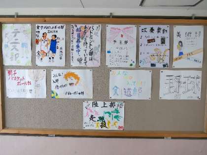 校内の掲示板に、クラブの紹介ポスターが掲示されました。明日の6限目に1年生への部活動紹介があります。