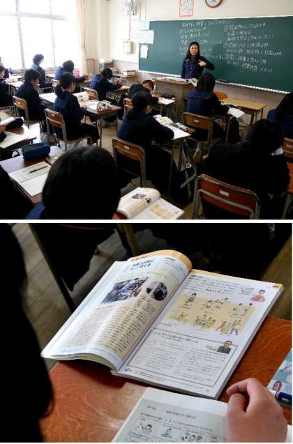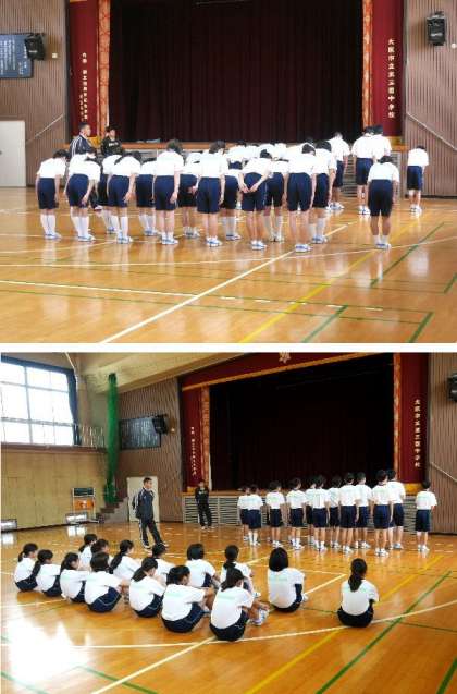各教科の授業が始まりました。1年生の家庭科では、食事の役割について学習していました。体育館では体育の授業で集団行動の練習をしていました。