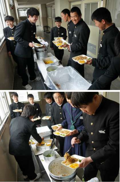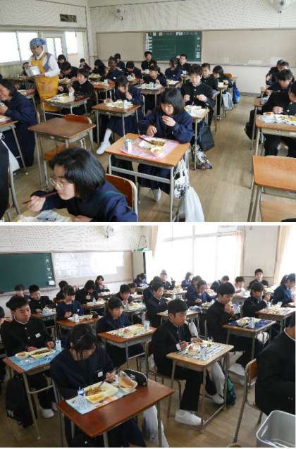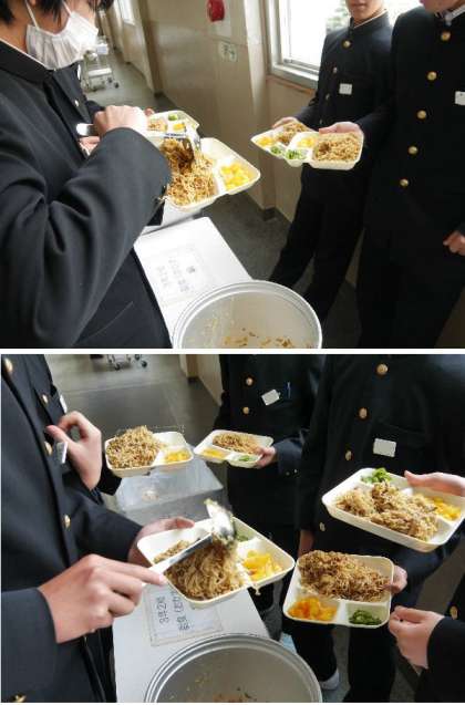 今日の給食はやきそばとパンです。3年生は身体も大きく、おかわりも山盛りですね。しっかり食べて部活動もがんばりましょう。1年生は静かに食べていました。