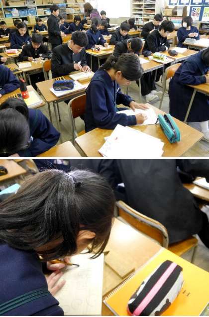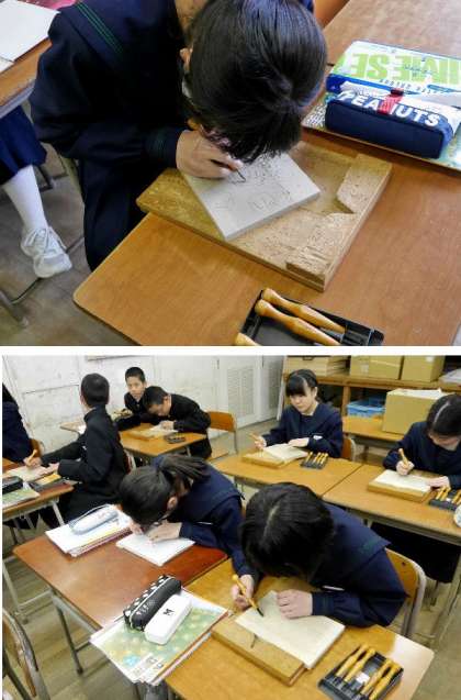 2年生が美術室で彫刻刀で彫っています。木彫りの彫刻です。それぞれ自分の絵を考えてデザインして彫っていきます。