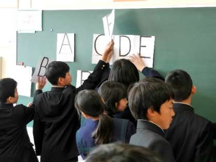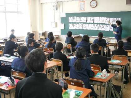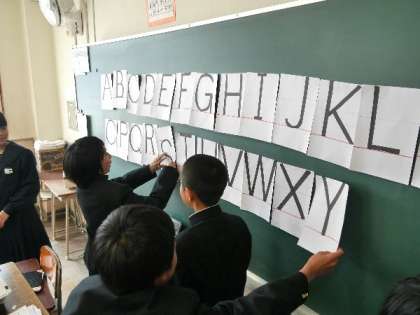 1年生の英語の授業ではアルファベットの学習をしていました。大きな画用紙に書かれたアルファベットを順番にすばやく黒板に並べていました。26文字がスムーズに発音できるよう練習していす。
