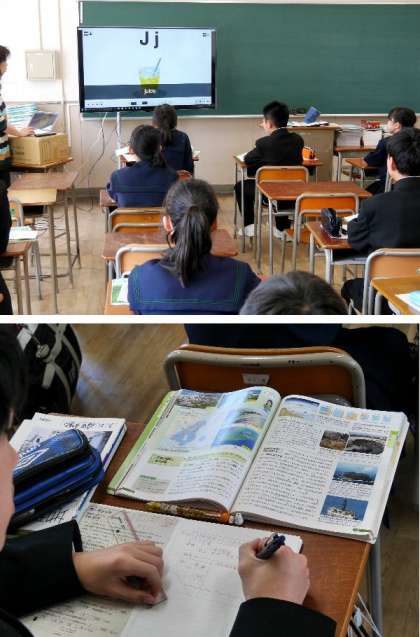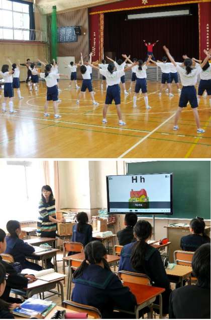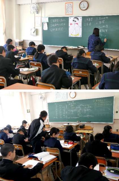 今日の授業の様子です。1年生の家庭科では栄養について学習していました。数学では「数の大小」を数直線で表す学習です。体育館ては2年生が体育の授業でラジオ体操を行っていました。英語ではフォニックスの発音、社会では日本の領域について学習していました。
