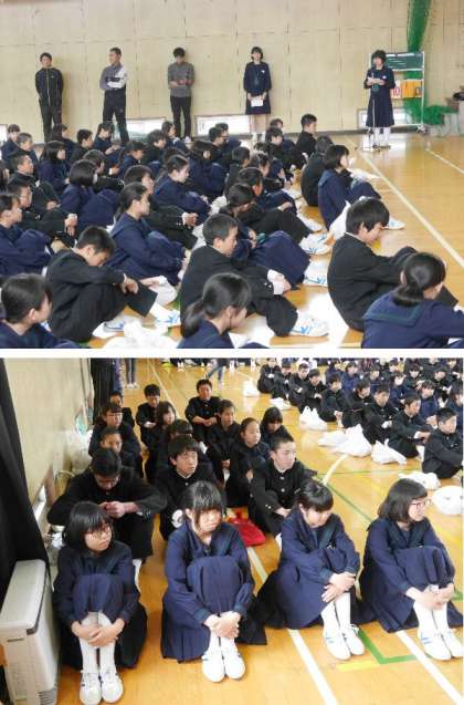6時間目は体育館で生徒会の役員選挙がありました。今回は6名の立候補者と応援演説者が舞台にあがって抱負を発表しました。