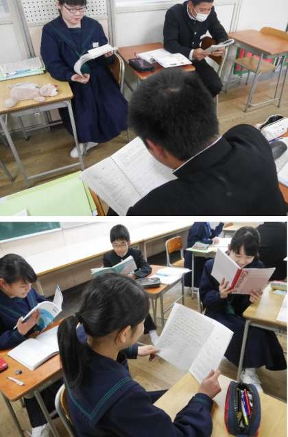 3年英語では「Show and Tell」で紹介する英文を考えて、ペアで練習していました。しっかりした英文ができているようです。英文の発音練習をがんばっていました。