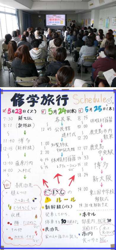 授業参観のあと、3年生は東三国センターで修学旅行の説明会を行いました。たくさんの保護者の方にきていただきました。今年は九州鹿児島方面となりました。修学旅行実行委員会の生徒が作った行程表が3年の廊下に掲示されています。とても楽しみですね。