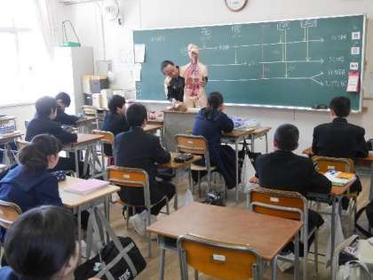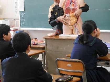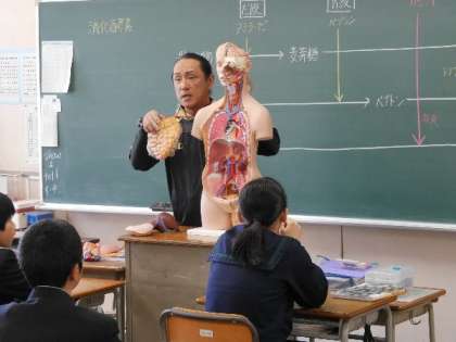 2年生の理科の授業では、先生が人体模型を見せています。この人体模型は内臓の中もみれるんですね。先生が中をめくって見せてくれています。自分の体のことだけど、どこに臓器があるか知っているかな?