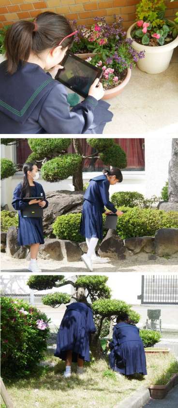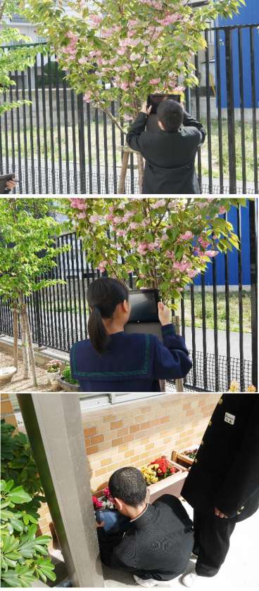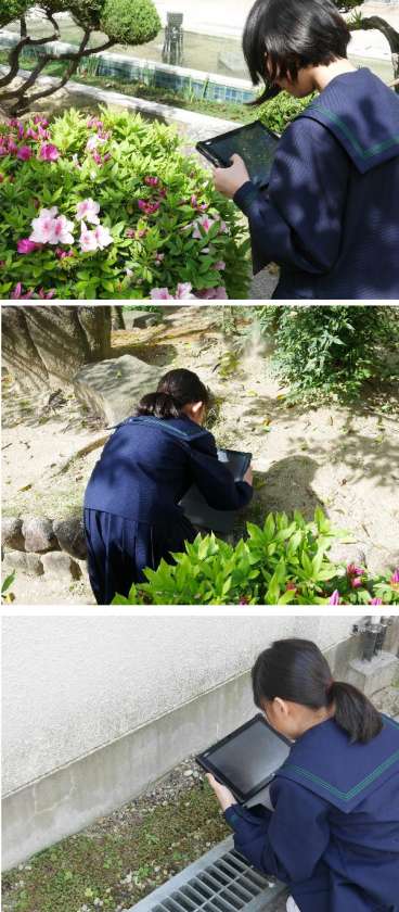 1年生の理科では、タブレットを持って校内を散策です。いろいろな植物をカメラに記録しています。教室では整理していきます。何を写そうかと思案しながら校内を散策中です。
