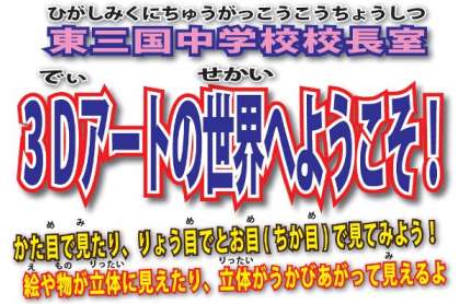 校長室前に3Dアートを掲示しました。目線を調整して遠くをみるようにしたり、より目にしてみると、上部の2つの黒丸が3つ見えたときに文字がうかびあがります。さて、なんて書いてあるでしょうか。わかった人は、そっと校長先生に答えあわせしてみてください。