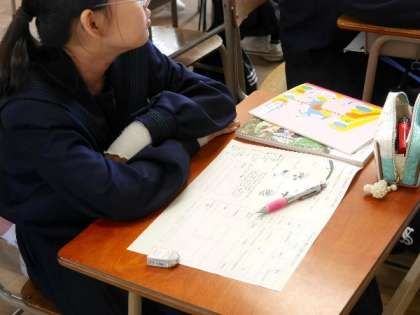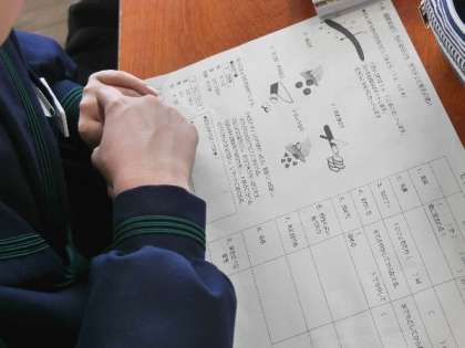 1年生の家庭科の授業では、調理実習にむけて、色々な切り方やゼラチンと寒天の違いについて学習していました。