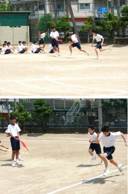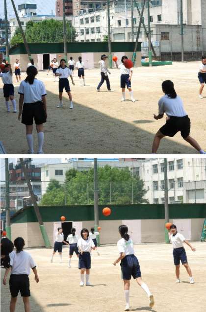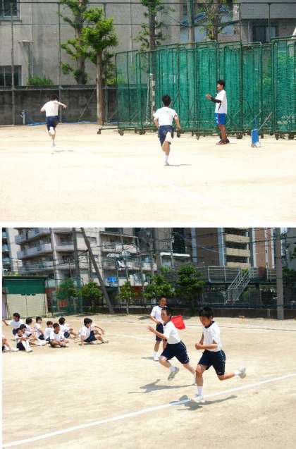 2年生の体育では、体力測定を行っています。50m走やハンドボール投げの練習をしてから測定をおこなっています。