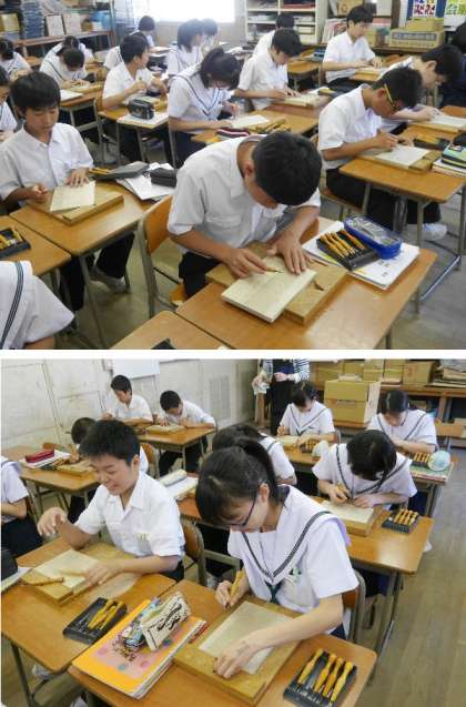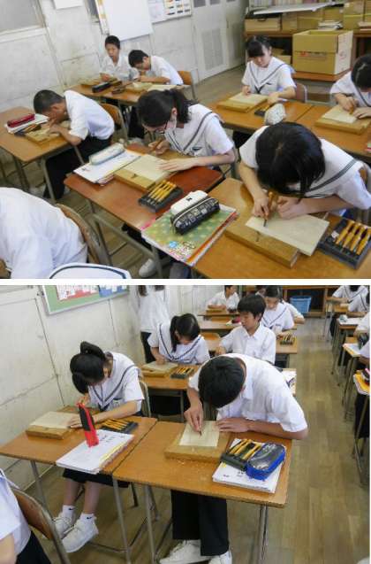 2年生の美術は美術室で彫刻です。レリーフを作るために自分で考えたデザインでがんばっています。手を怪我しないようにきをつけてくださいよ。