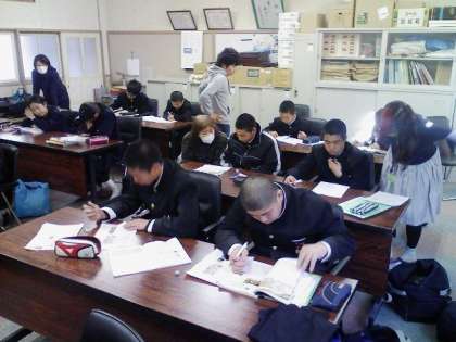 この「自主学習会」も少しずつ希望者が増えて、今日は14人の生徒がテスト勉強に取り組みました。