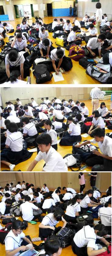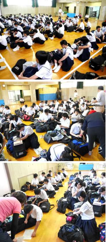 3年生は修学旅行の荷物を学校に持ってきて点検確認しました。忘れているものはないでしょうか。明日からの修学旅行がたのしみですね。明日は直接、新大阪駅に集合です、電車でくる人、歩いてくる人もいますが、遅れずにきてくださいね。