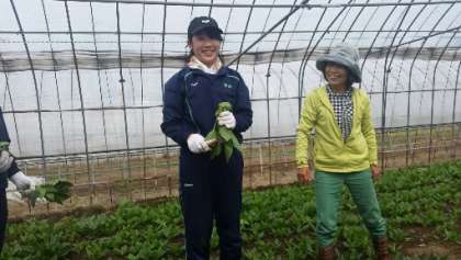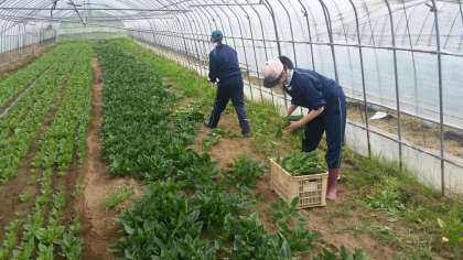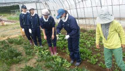 修学旅行二日目のスタートです。朝からきゅうりやホウレン草の収穫です。
