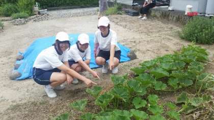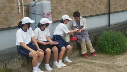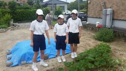 民家での体験学習。サツイモとシソを植えて一休み。新茶をいただきました。