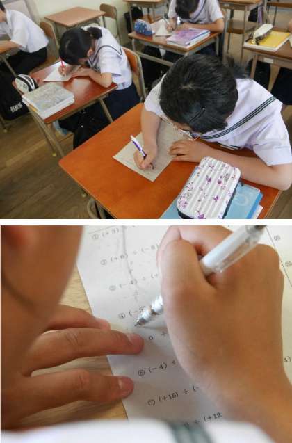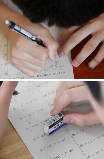 1年の数学では、小学校では習わない負の数の計算を行います。今日は総仕上げとして、正の数と負の数の除算の問題を一斉に解きます。さあ、間違えないで計算ができるかな?