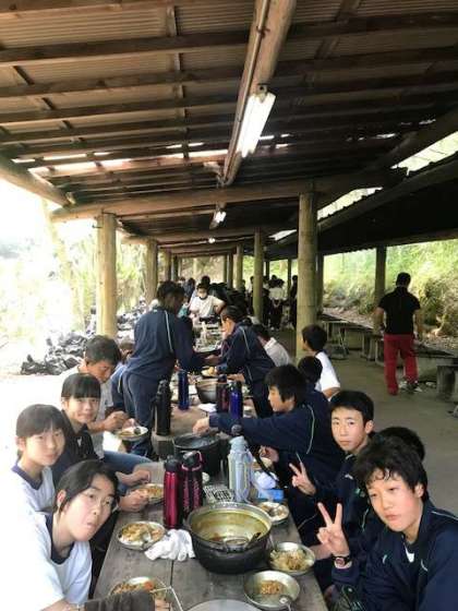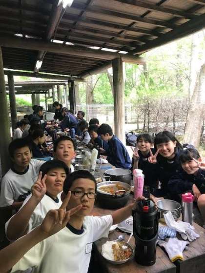 いただきます。出来上がったカレーライスをいただきます。自分たちで作るとおいしいですね。