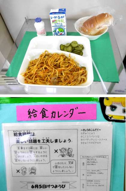 今日の献立は、スパゲッティミートソース、こくとうパン半分、きゅうりのピクルス、牛乳です。スパゲッティはおいしいですね。しっかりおかわりしました。
