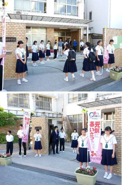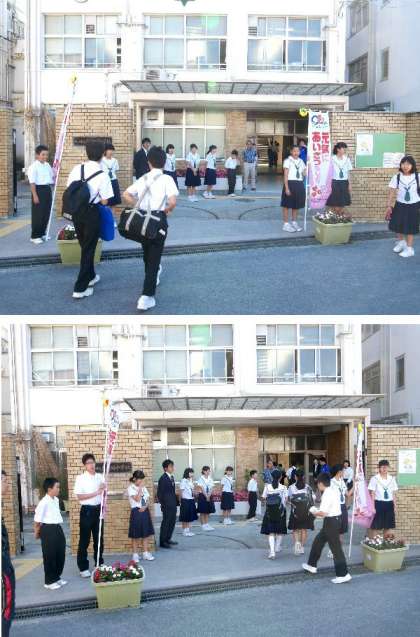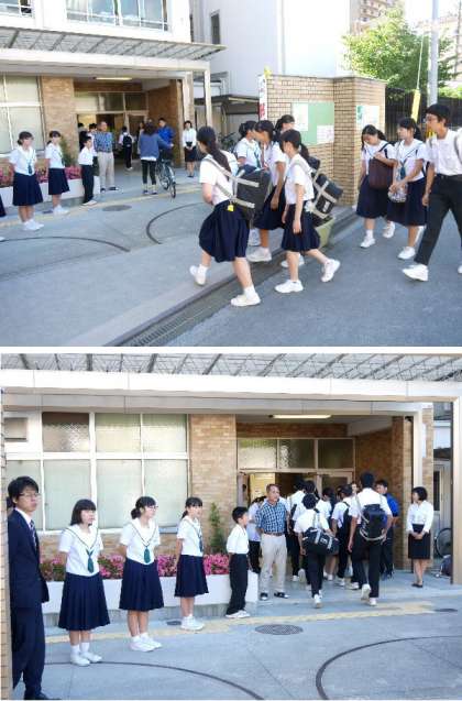 東三国中学校の玄関では、朝8時から、元気な生徒たちの声が響きます。「おはようございます」・・・と生徒会や風紀委員が整列して出迎えます。元気いっぱいの姿に毎朝元気をもらえます。