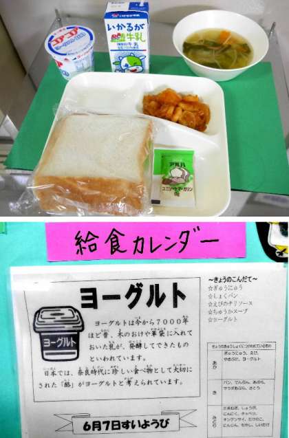 今日の献立は、食パン、えびのチリソース、ヨーグルト、牛乳です。
