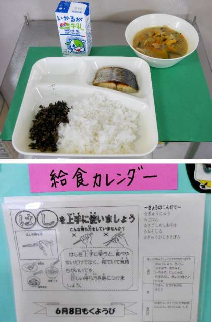 今日の献立は、さごしの塩焼き、牛ひじきそぼろ、味噌汁でした。