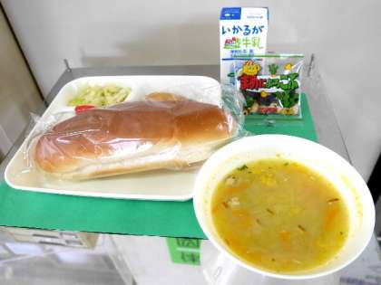 今日の献立は、大型コッペパン、サーモンフライ、コーンスープ、キャベツのソテーでした。