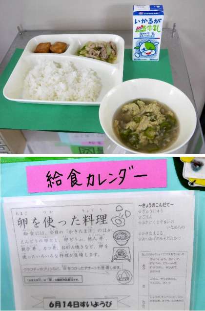 今日の献立は、豚肉と野菜の炒めもの、厚揚げの味噌だれかけ、かきたま汁、ごはん、牛乳です。
