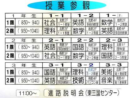今日は、土曜授業の授業参観です。1限〜2限、各教室での授業参観です。ぜひご来校いただき、生徒たちの様子をご覧ください。11時〜き東三国センターにて進路説明会を開催いたします。3年生だけでなく、全校対象となっています。毎年変わる進路日程などの説明をおこないます。