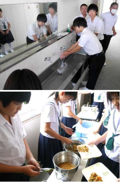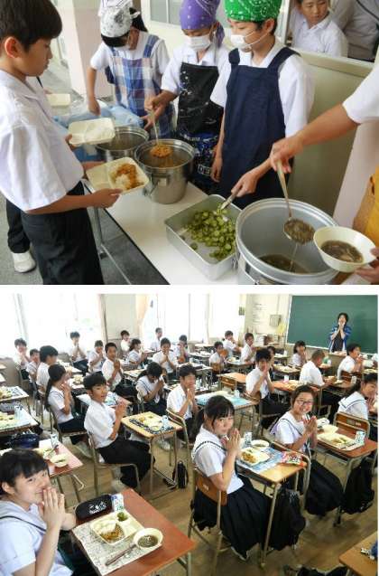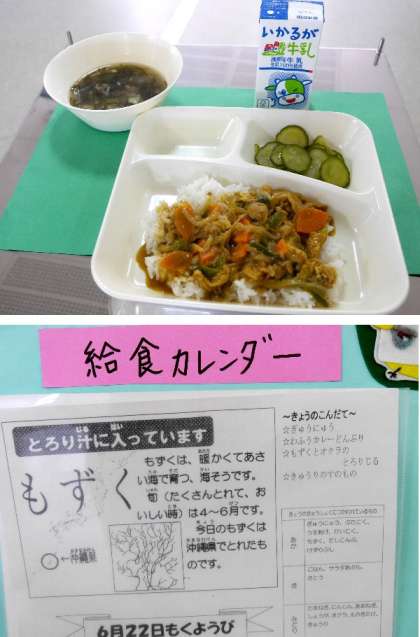 今日の献立は、和風カレーどんぶり、もずくとオクラのとろりじる、きゅうりの酢のものでした。カレーはおいしいですね。1年生はみんなで「いただきます」をしてくれました。