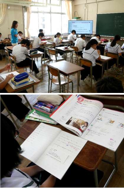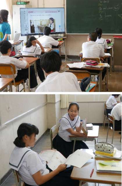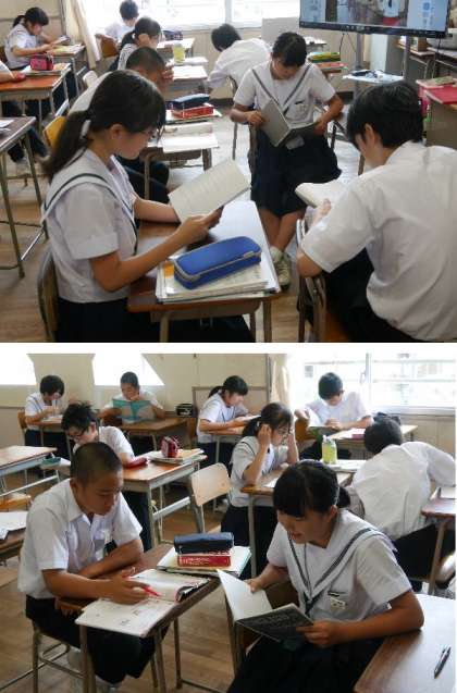2年生の英語の授業です。デジタル教科書の発音も聞きながら教科書の音読練習です。