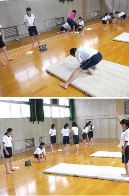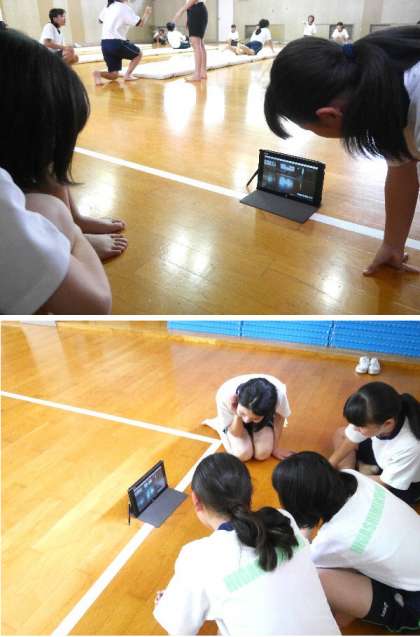 2年女子の体育の授業です。タブレットのカメラ機能で、遅延再生機能を使って、演技した数秒後に再生されるので、演技した後にタブレットですぐに確認できます。確認シートでチェックポイントを自己採点しています。
