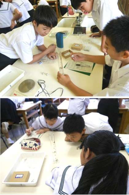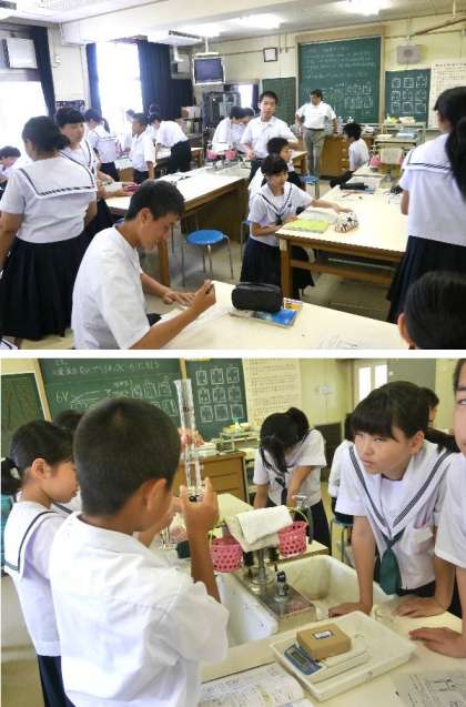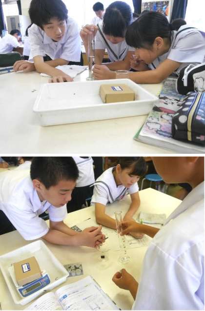 1年生の理科の授業は理科室で行われていました。「密度による物質の区別」の学習で、メスシリンダに水をいれて、いろいろな重さの重りをいれて計測していました。