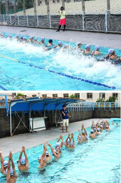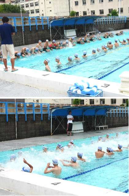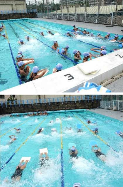 1年生の初めてのプールの授業がありました。2学級が合同なので、1年生全員がプールに入りました。