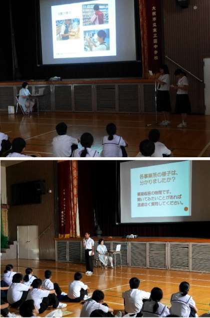 2年職場体験報告会は、1年生を招いて行われました。1年生は来年に職場体験を行うので参考にしてほしいですね。6種の職種から一つずつ発表されました。プレゼンもとてもよくできていて、わかりやすかったですよ。