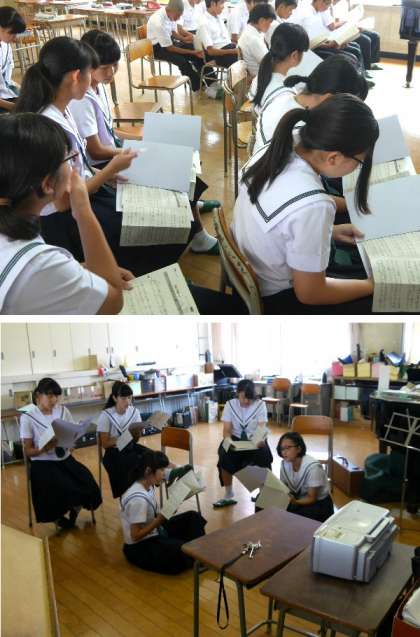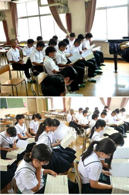 3年生では、各学級の合唱曲がきまり練習が始まっています。パート別に分かれて練習です。