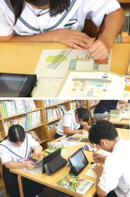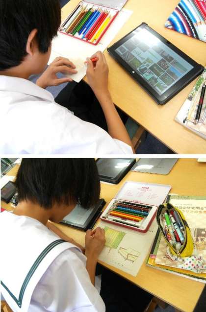 2年の家庭科では住居について学習しています。自分らしい住まいを、インテリアなどはインターネットで最新のものを参考にしながらデザインしています。