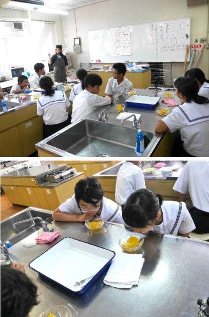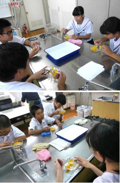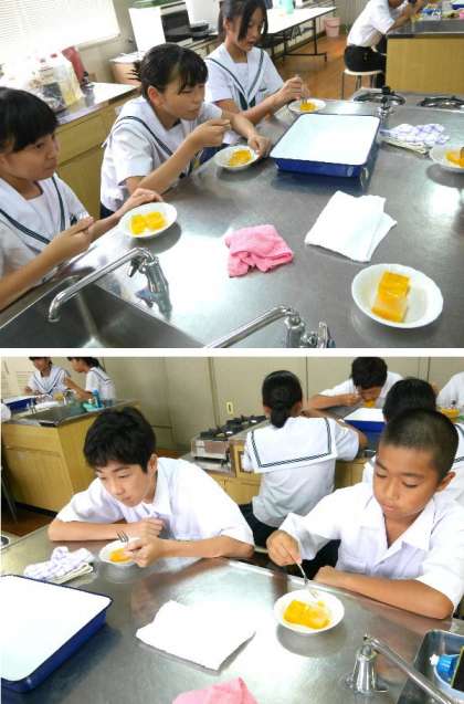 1年生が家庭科調理室で授業をしています。先生が作った、みかんをゼラチンと寒天で固めたものを食べ比べています。寒天は海草から、ゼラチンは動物の骨や皮のコラーゲンだったんですね。風味や色合いも少しちがいますね。