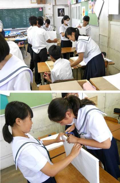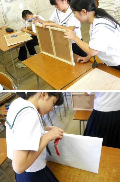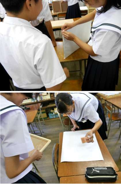 2年生の美術では、パネルを作っていました。用紙の裏に水うちをして、パネル板にしっかりと貼って固定します。