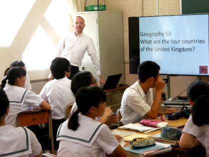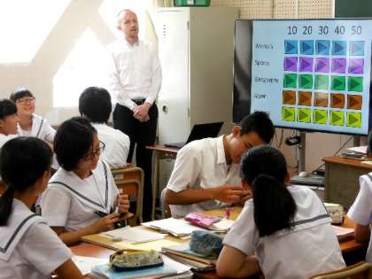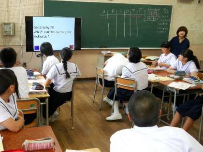 3年生の英語の授業です。英語ネイティブの先生が英語でクイズを出題してくれています。イギリスは何国でなりたっているのかな。むずかしいですね。