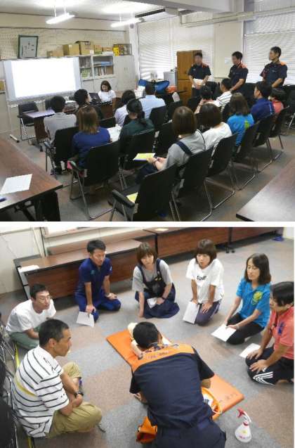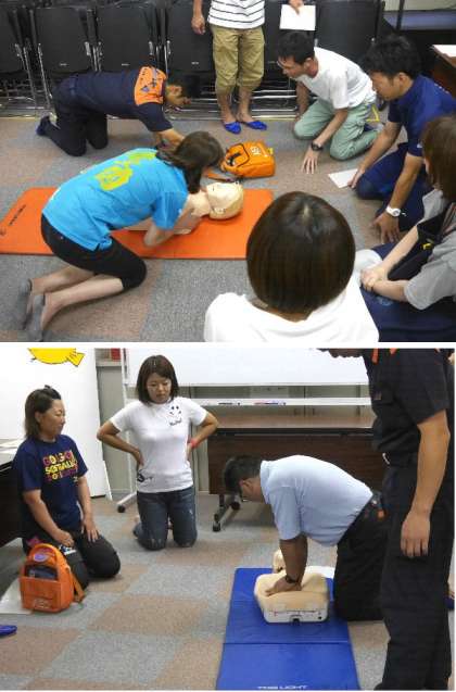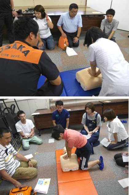淀川消防署よりきていただき、先生がたの救急救命講習をおこないました。人工呼吸や心肺蘇生、AEDを使った実習もおこないました。救急救命研修は毎年おこなっていますが、万が一のために対応できるように一次救命措置を身につけるためにおこなっています。