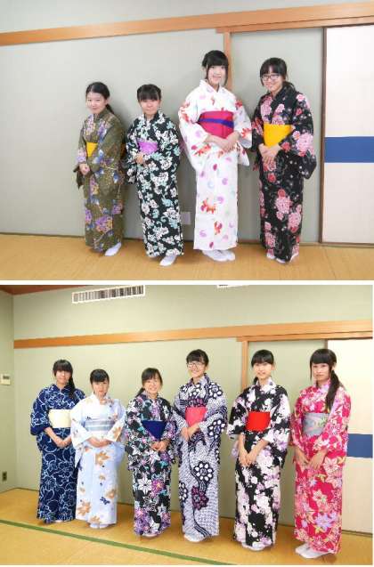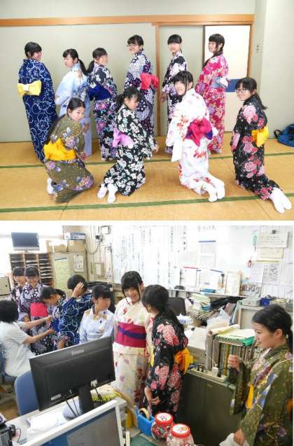手芸部主催の浴衣の着付け講習会で、とてもきれいに浴衣を着ることができました。とてもかわいく着れましたね。着つけたあと職員室に来て披露してくれました。