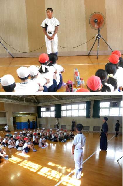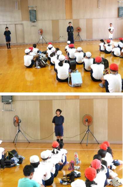 今日から3日間の放課後に、校区小学校の2校から小学6年生が、中学校の部活動の体験学習にきました。今日は、剣道部、野球部、バレー部の体験です。小学生の児童たちは少し緊張しながら中学生の説明を聞いていました。このあと、3つのクラブに分かれて体験します。