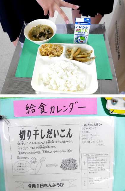 今日の献立は、イワシの天ぷら、みそしる、切り干し大根の炒め煮、ごはん、牛乳でした。