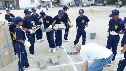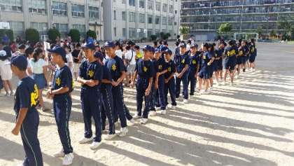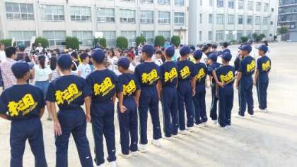 新東三国小学校で校庭キャンプが行われました。東三国中学校のジュニアリーダーたちが参加し、手伝っています。