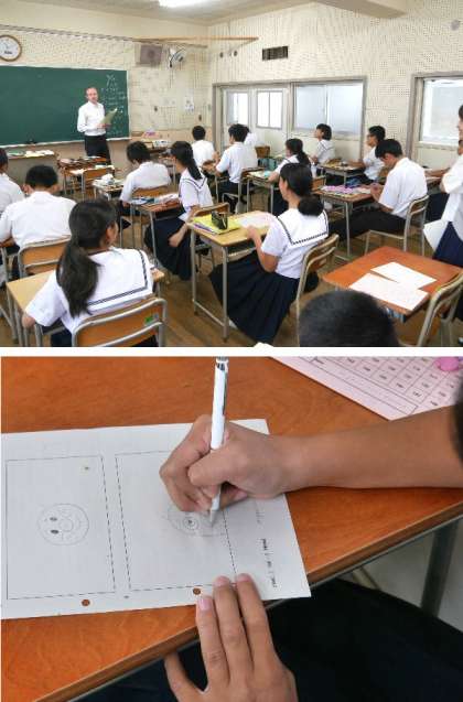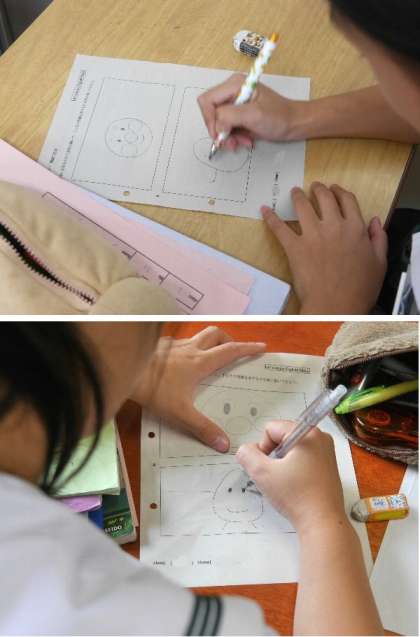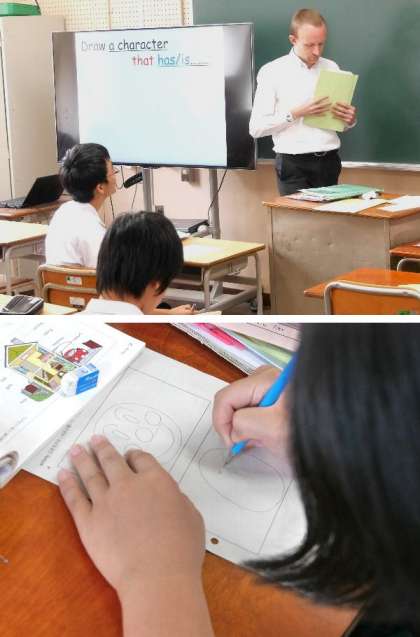 3年の英語の授業です。ネイティブの先生が質問をしていきます。それを聞き取って、キャラクターの絵を画いていきます。顔は卵型、口はスマイル・・・さて何のキャラクターでしょうか。