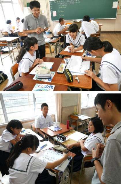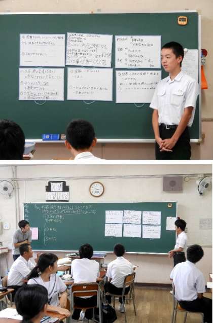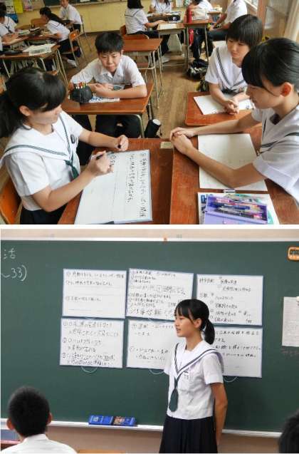 3年の社会科の授業では、「現在社会の文化と私たちの生活」について学習しています。文化の役割について、各班で話し合ってホワイトボードにまとめています。各班ともしっかり意見をだしあって、それぞれの意見を発表しながら授業をすすめていました。