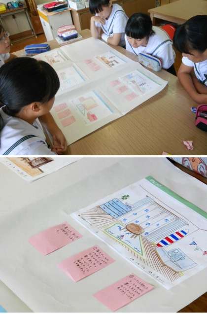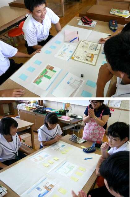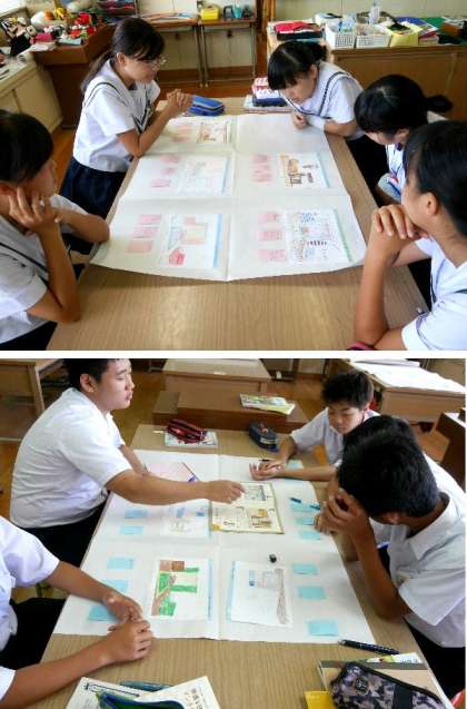 2年の家庭科の授業です。子ども部屋のインテリアコーディネートをしてみました。自分のデザインを班の皆に互いに説明しあっています。