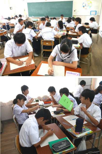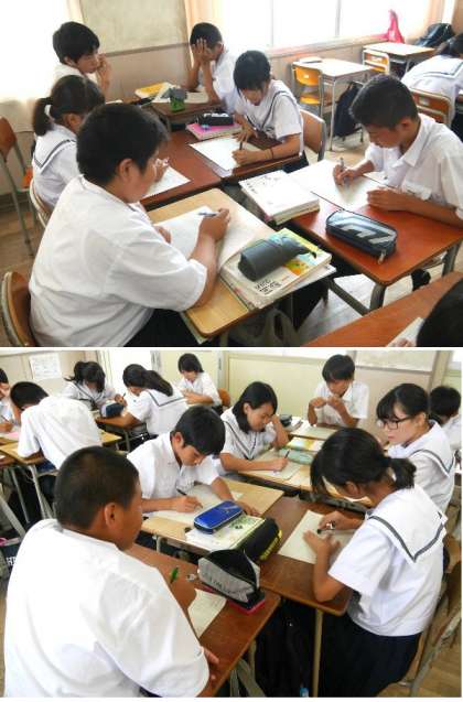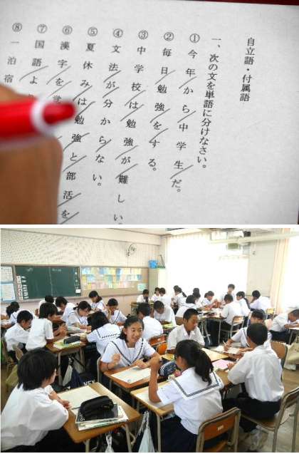 1年生の国語では、いろいろな文を単語に分けていました。グループになって皆で考えながら学習していました。わきあいあいと学習が進められています。